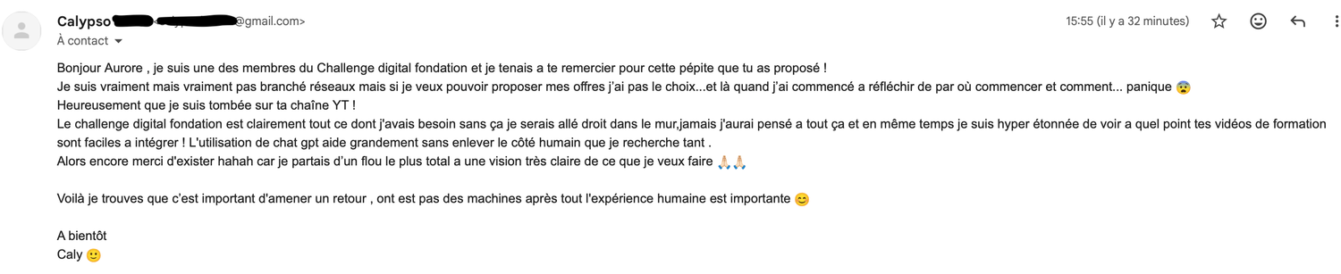 En 4 ans, je n’ai jamais réussi à trouver une vraie niche. Et puis, j’ai suivi ce challenge qui m’a fait énormément de bien. Pas juste des vidéos à regarder, mais un vrai cheminement.